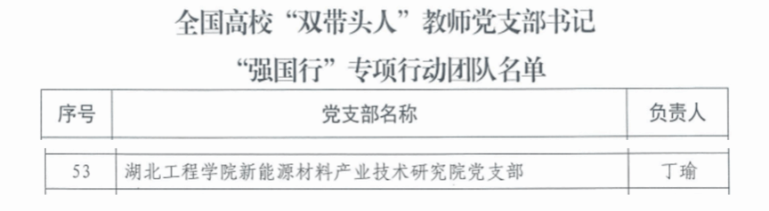 近日,教育部思想政治工作司公布了全国高校“双带头人”教师党支部书记“强国行”专项行动团队名单,公司太阳成tyc122cc集团新能源材料产业技术研究公司党支部成功入选。此次入选,是公司基层党组织首次入选全国“强国行”团队,也是公司高质量党建引领事业高质量发展的重要成果,为公司基层党支部标准化规范化建设提供了样板和示范。