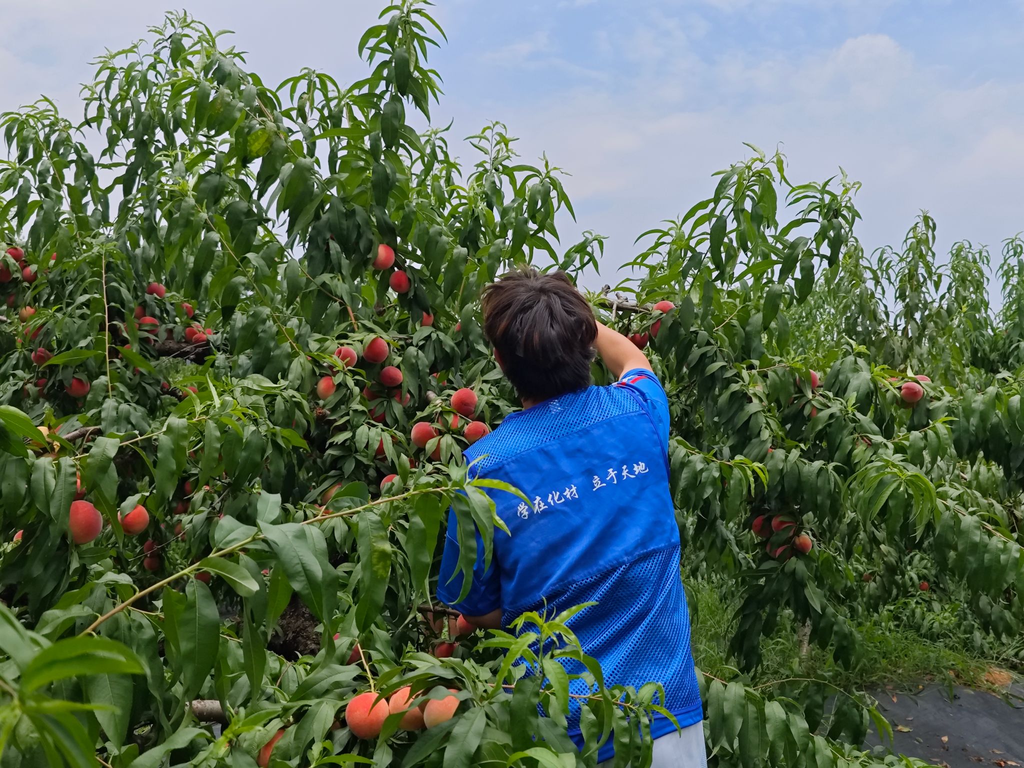 在桃农的指导下,学子们挽起裤腿进入桃园,戴上手套开始包装,边学边干,很快就掌握了鲜桃采摘,分类包装等技巧。劳动中,学子们干劲十足,全身心投入到农忙当中,一会儿工夫就摘下了几大桶,包装了十余箱桃子,在场桃农都夸赞不已。