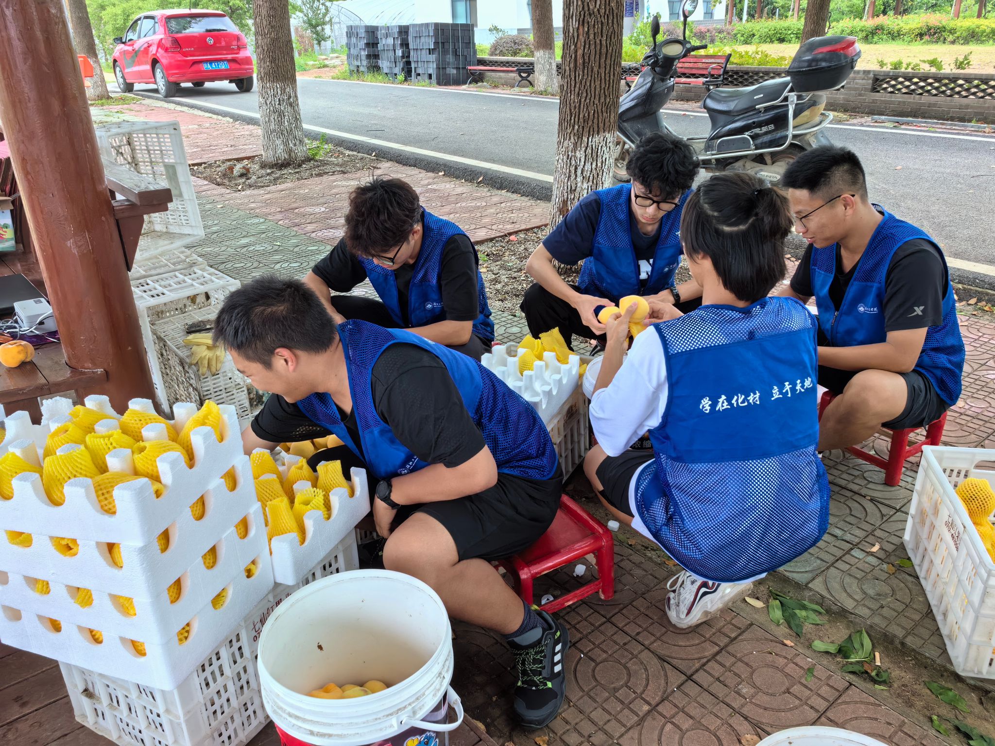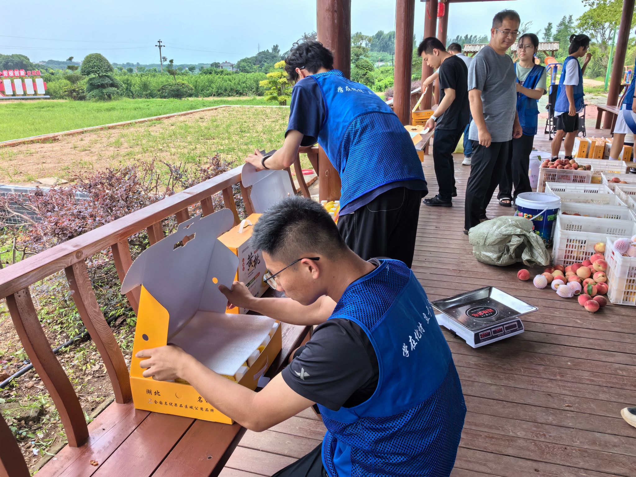 在丰山镇七仙红桃产业园这里,来自太阳成tyc122cc集团的学子正有条不紊地帮助桃农们进行桃子的采摘和装箱。前期,在得知七仙红桃产业园处于销售旺季忙不过来的情况后,主动请缨组建助农小分队,希望能到产业园做点力所能及的事,公司党委副书记赵勇及时联系了七仙红桃产业园,带领助农小分队到田间地头开展劳动实践,贡献湖工学子力量。