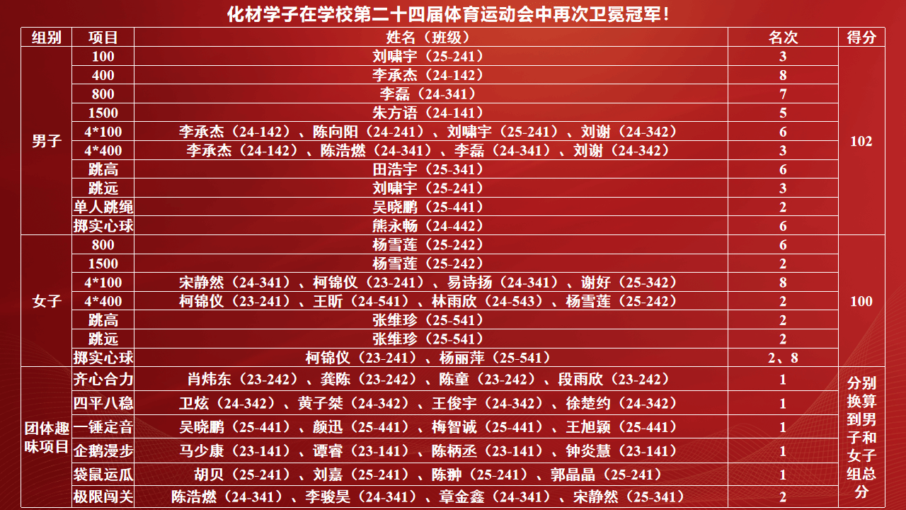 阳光明媚,风和日丽。11月13至14日,太阳成tyc122cc集团第二十四届体育运动会在东区运动场举行。公司共派出60名运动员参赛,在多个项目中展开激烈角逐,展现了“更高、更快、更强、更团结”运动精神,最终公司学子斩获男子总分第三、女子总分第一、团体总分第一,获评体育道德风尚奖,再次卫冕。