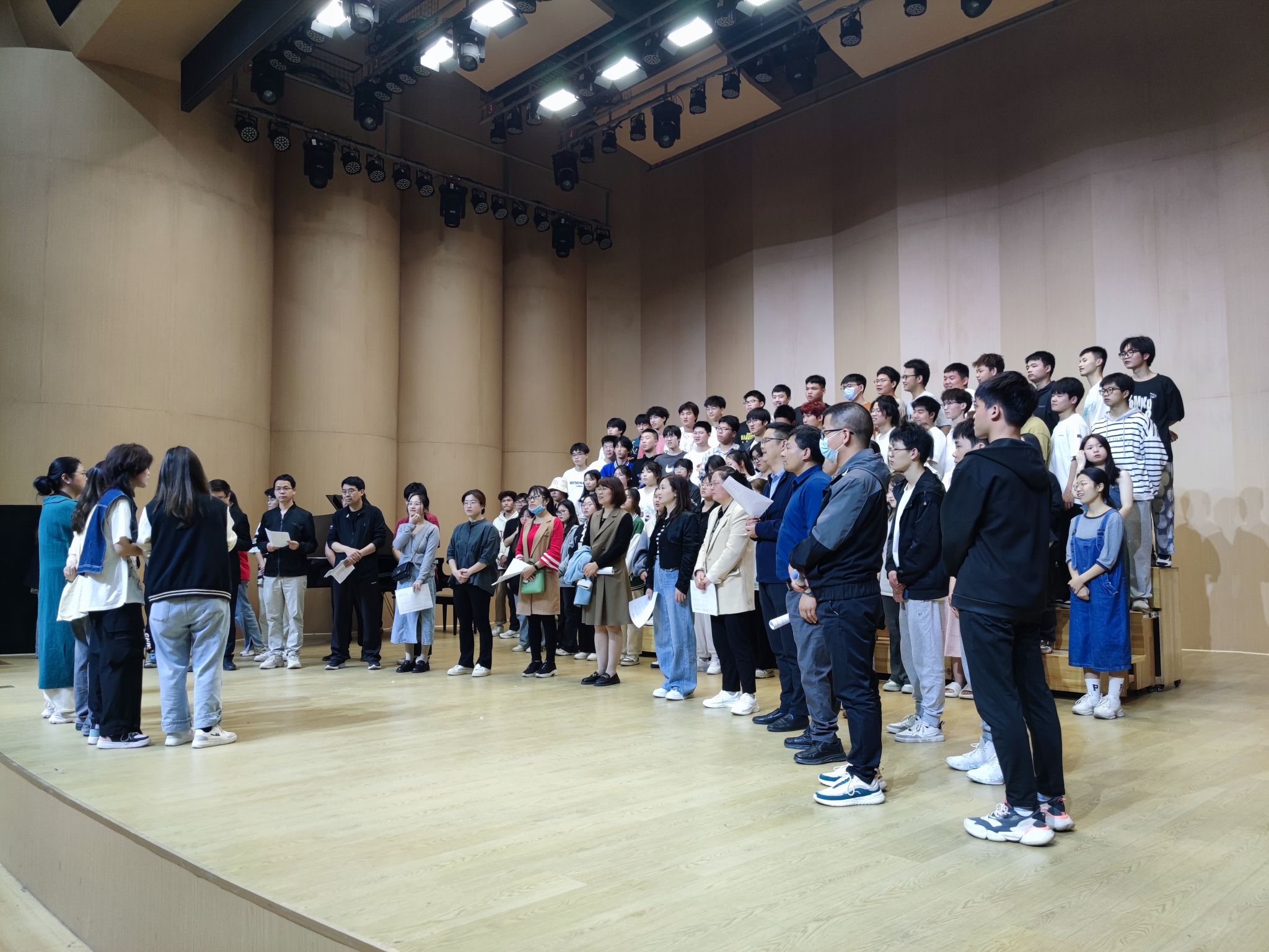 公司党委高度重视此次活动,动员全院师生组建了一支由院领导、班主任、教工党支部书记、学工组老师及员工组成的九十人师生合唱团。公司员工课程节奏紧凑,实验课较多,很多同学做完实验就匆匆赶去排练。排练历时两个月,院领导和排练老师们反复沟通,尽量为同学们合理安排排练时间。音乐公司老师和志愿者们,从发声技巧到情感表达,为师生们悉心指导。每次排练同学们都全身心投入。